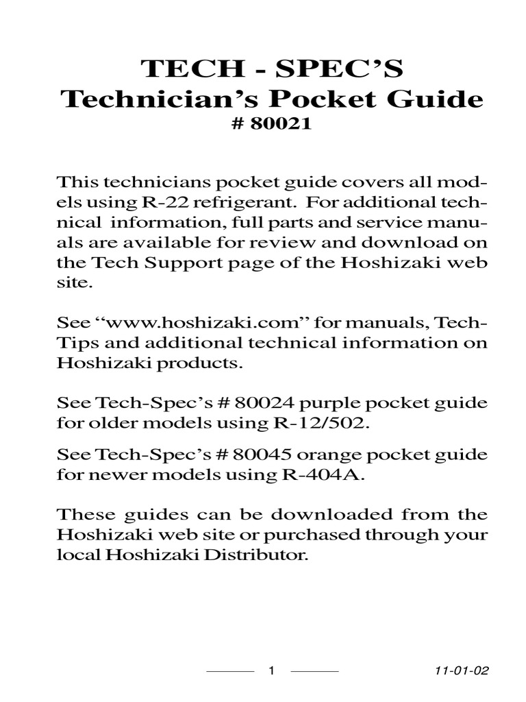 . Technical information full parts and service manuals are available for review and download on the Tech Support page of the Hoshizaki web site. Should the reader have any questions or concerns which have not been. I CONTENTS PAGE.